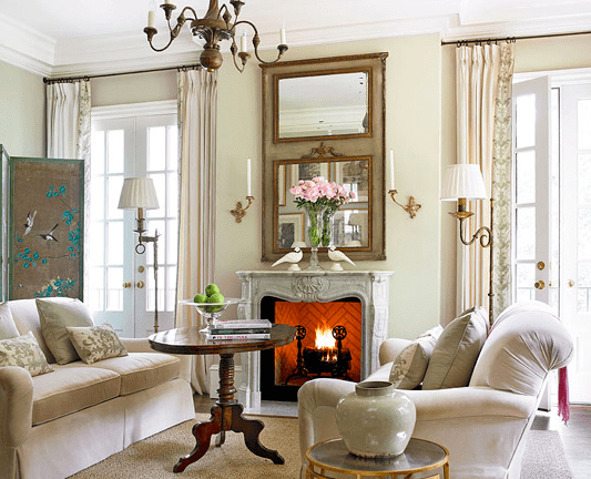 When going for a traditional style think upholstered furniture in plain colours, and formal/predictable placement of furniture, e.g., a bed head against the longest wall, and a lounge facing a fireplace.